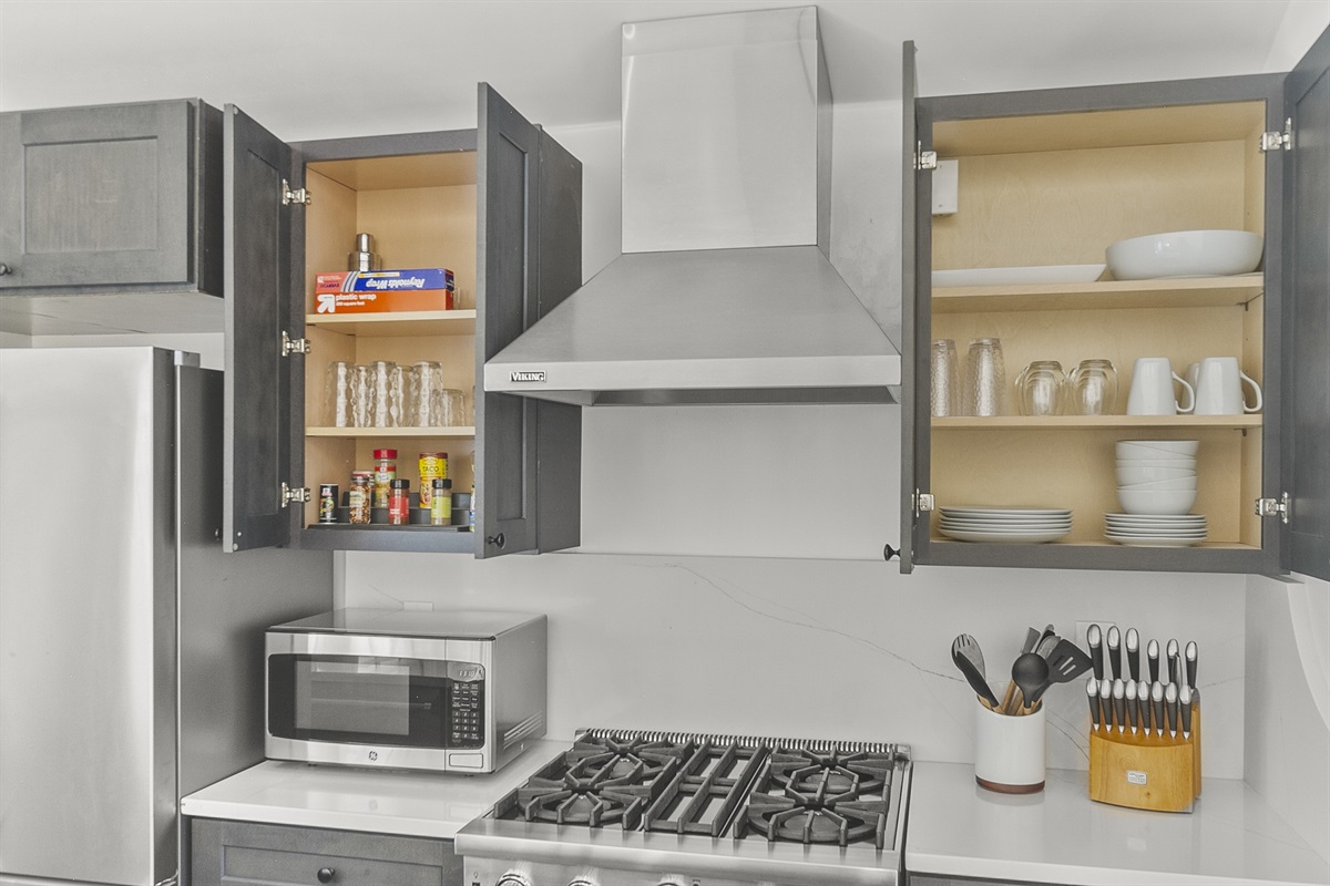 The large Smart TV serves as the centerpiece to a cozy and comfortable living room with access to the outdoor covered patio. The adjoining dining room & kitchen seat a total of 4 with an additional table and 4 chairs on the patio. The gorgeous kitchen offers waterfall countertops and Viking appliances. Washer/dryer off of the kitchen.
